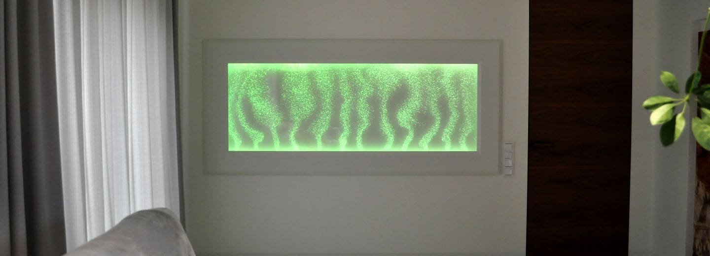 Існує два варіанти подачі повітря: постійна подача (всі форсунки монопанелі працюють одночасно) або керована подача (за допомогою спеціального контролера). Програми для контролера, розроблені майстернею “GloryJ”, дають можливість передати завчасно продуману схему порядку розпилення повітря всередині монопанелі. Керуємо усім цим через SMART-пристрої. Як правило, варіант із контролером використовуємо в монопанелях, які виготовляємо без акрилових вставок.