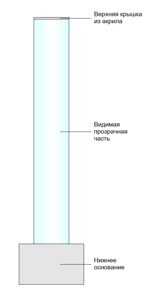 Видимая часть (в которой видны пузыри) состоит из одной акриловой трубы высотой до 1900 мм и диаметром до 200 мм.